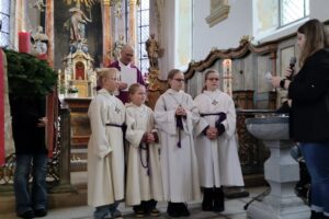 Messdiener in Remblinghausen: Am 1. Adventssonntag wurden vier neue Messdienerinnen feierlich von Pater Karl Brahm im Familiengottesdienst in die Ministrantengruppe aufgenommen. Emma Blome, Luisa Blome, Hanna Blome und Neele Staudt (von links nach rechts) gehören nun zu dem Messdiener/innen in Remblinghausen. Die Gemeinde St. Jakobus heißt die vier neuen Messdienerinnen herzlich willkommen und freut sich sehr über ihren Einsatz als Messdiener in den Gottesdiensten. Foto: Markus Stockhausen