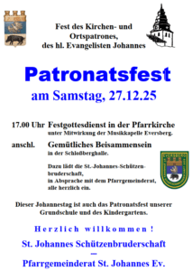 Patronatsfest: Eversberg feiert am Samstag, 27. Dezember, dem Tag nach Weihnachten, das Fest seines Kirchen- und Ortspatrones, des hl. Evangelisten Johannes. Der Festgottesdienst beginnt um 17 Uhr in der Pfarrkirche. Die Musikkapelle Eversberg wird mitwirken. Anschließend laden die St.-Johannes-Schützenbruderschaft in Absprache mit dem Gemeindeteam alle zu einem gemütlichen Beisammensein in die Schloßberghalle ein.