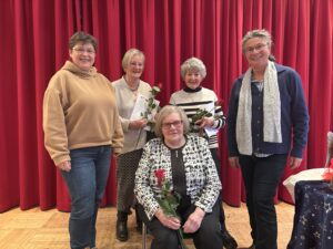Das Foto (U. Tolksdorf) zeigt die Geehrten Marlies Büngener (vorn, Mitglied der kfd Mariä Himmelfahrt seit 65 Jahren) sowie Maria Kunert und Helga Hegener mit den Vorstandsmitgliedern Conny Berkenkopf und Monika Remmel.