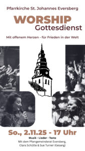 Worship-Gottesdienst: Der Pfarrgemeinderat Eversberg lädt zum Thema „Mit offenem Herzen – für Frieden in der Welt“ zu Musik, Liedern und Texten am Sonntag, 2. Novembeerum 17 Uhr in die St.-Johannes-Pfarrkirche ein. Gerade in diesen Zeiten , in denen der Frieden in Gefahr ist, soll dieser Gottesdienst mit bewegenden, poppigen und modernen Lobpreis-Songs und Texten auch Raum für Meditation und Besinnung öffnen. Mitwirkende sind neben Mitgliedern des PGRs die Sängerinnen Clara Schütte und Sue Turner.