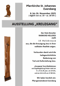 : In der St.-Johannes-Pfarrkirche stellt der Holzkünstler Raimund Hellekes anhand von fünfzehn verschiedenen Holzkreuzen „die Kreuzigung Jesu in ihrer radikalen Realität“ dar. Verbunden damit wird die „heilsgeschichtliche Bedeutung von Tod und Auferstehung Jesu“. Die Ausstellung kann vom 8. bis 26.11.25, täglich von ca. 10 bis ca. 18 Uhr, besichtigt werden. Der Pfarrgemeinderat lädt zu Kurzmeditationen mit Orgelbegleitung am 8. und 9. November., jeweils um 14 Uhr, ein. Am 16.November findet um 17 Uhr eine weitere Andacht zu diesem Thema statt.