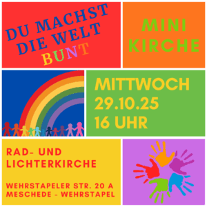 Kinderkatechese in St. Walburga: Die Termine der Kinderkatechese (Sonntags parallel zur Messfeier um 11 Uhr) werden zukünftig über die App Churchpool (Gruppe „Familie und Kirche“) veröffentlicht. (Ein wöchentlicher Turnus oder die Veröffentlichung in den Pfarrnachrichten entfallen.)
