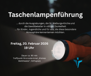 Taschenlampenführung: Am Freitag, 20. Februar, sind um 19 Uhr alle Kinder, Jugendlichen und interessierte Erwachsene zu einer Taschenlampenführung durch und unter St. Walburga herzlich eingeladen.