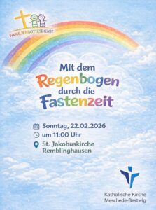 - Am 1. Fasten-Sonntag, 22. Februar laden wir um 11 Uhr zum Familiengottesdienst in die Jakobuskirche ein, und starten gemeinsam den Regenbogenfarben näher zu kommen. Im Anschluss bietet das Gemeindeteam einen gemeinsamen Mittagstisch im Jakobushaus an. Das Motto „Messen und Essen“ lädt ein zusammen Gottesdienst (Messe) zu feiern, gemeinsam Mittag zu Essen und miteinander ins Gespräch zu kommen. Es wird ein Suppenangebot vorbereitet, um die Unkosten zu decken, kann jeder geben, was er kann.