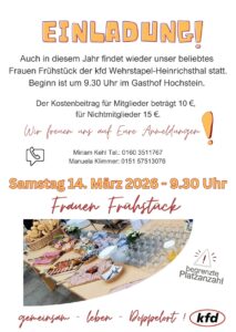 Herzliche Einladung zum Frauen Frühstück am 14. März! Bitte unbedingt anmelden bei Miriam Kehl (Tel. 0160 3511767) oder Manuela Klimmer (Tel. 0151 57513076)