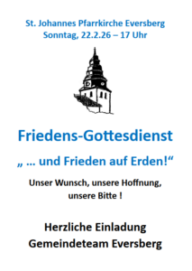 „Hoffnung auf Frieden auf Erden“: Diese Hoffnung soll im Rahmen des Friedensgottesdienstes zum Ausdruck kommen, der am Anbetungstag, Sonntag, 22. Februar, um 17 Uhr in der St.-Johannes-Pfarrkirche stattfinden wird. Das Gemeindeteam wird noch alle, die ihn mit vorbereiten möchten, zu einem Treffen einladen. Ansprechpartner sind Kathrin Hohmann und Thomas Wagner.