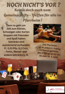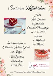 Ökumenisches Friedensgebet: Angesichts von Nöten, Kriegen und Gewalttaten möchte das Gebet die Sehnsucht nach Menschlichkeit vor Gott bringen und bestärken in der Hoffnung, dass Frieden und Verständigung möglich sind. Der nächste Termin wird demnächst bekannt gegeben.