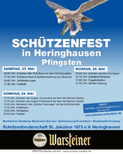 Schützenfest: Wie gewohnt, an Christi-Himmelfahrt, eröffnen die St. Josefs-Schützen aus Heinrichsthal-Wehrstapel die Festsaison im Mescheder Stadtgebiet und laden im Namen des gesamten Vorstandes für den 13. – 15.Mai in die Schützenhalle in Wehrstapel ein.