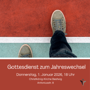 Den Start in das neue Jahr bewusst begehen, das Vergangene in Gottes Hände legen und um seinen Segen für das neue Jahr bitten, dazu lädt das Team der Projektkirche Christkönig Bestwig am Neujahrstag ein (Donnerstag, 1. Januar). Die Wort-Gottes-Feier (mit Kommunion) beginnt um 18 Uhr. Im Anschluss stoßen wir auf das neue Jahr an. Herzlich willkommen!