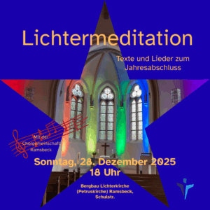 Das Gemeindeteam und die Caritaskonferenz Ramsbeck laden ein zu einer Lichtermeditation am Sonntag, 28. Dezember um 18 Uhr in der ev. Lichter-Kirche in Ramsbeck (Schulstr.). Mit besinnlichen Texten und modernen Liedern wird der Jahresabschluss auf besondere Weise begangen. Dieses Mal wird auch die CHORgemeinschaft Ramsbeck die Meditation mitgestalten. Herzlich willkommen!