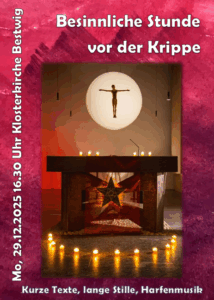 Zu einer weihnachtlichen Stunde zwischen den Jahren lädt das Bergkloster Bestwig ein am Montag, 29. Dezember um 16.30 Uhr in der Kirche des Bergklosters. Die Stunde vor der Krippe wird von Gästen gestaltet, die die Texte aussuchen und lesen, im Übrigen nach dem Rhythmus: Text – Stille – Harfenmusik. Der Eintritt ist frei.