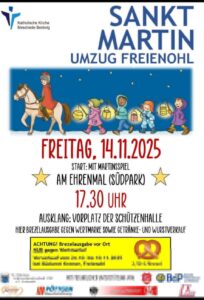 Die Pfarrgemeinde St. Nikolaus und der Teilstandort Wennemen der St. Nikolaus Grundschule Freienohl laden herzlich zum diesjährigen Martinszug ein, der am Montag, 10. November, stattfinden wird. Gemeinsam wollen wir dann an den heiligen St. Martin gedenken, der seinen Mantel mit einem Bettler teilte. Bevor sich der Martinszug in Bewegung setzt, gibt es um 17.45 Uhr eine kurze Andacht in der Kirche, wo die Grundschulkinder einen Impuls zum Thema