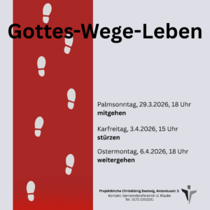 … das ist der Leitgedanke für die Veranstaltungen in der Projektkirche in der Fastenzeit und Ostern 2025. Neben den Gottesdiensten laden wir ein zu einem Kirche+Kino-Abend und zu einem besonderen Konzert.