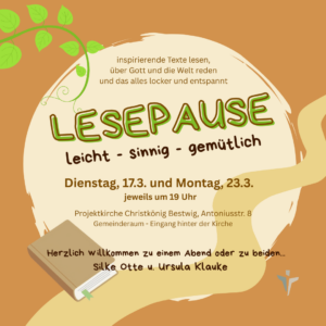 Einen „sinnigen“ Text gemeinsam lesen und darüber ins Gespräch kommen, dazu laden wir an zwei Abenden ein. Herzlich willkommen an einem oder beiden Terminen: Mittwoch, 26. November und Dienstag, 2. Dezember, jeweils um 19 Uhr im Königskeller (Gemeinderaum hinter der Christkönig-Kirche in Bestwig). Wir freuen uns auf anregende Gespräche über Gott und die Welt. Silke Otte und Ursula Klauke