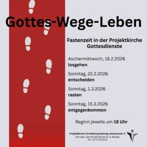 … das ist der Leitgedanke für die Veranstaltungen in der Projektkirche in der Fastenzeit und Ostern 2025. Neben den Gottesdiensten laden wir ein zu einem Kirche+Kino-Abend und zu einem besonderen Konzert.